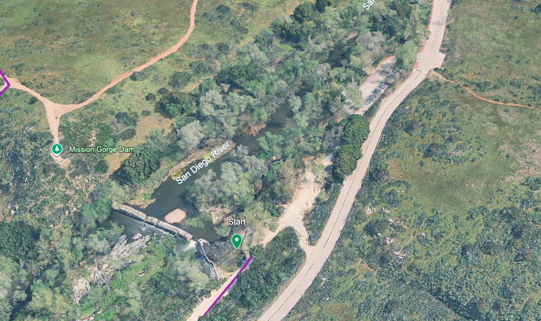 Begin your walk at the historic Old Mission Dam, a landmark built in the early 1800s to supply water to the San Diego Mission. From here, the trail heads north into Oak Canyon, following a seasonal creek lined with towering oaks and sycamores. This shaded canyon path leads toward Highway 52, offering a peaceful escape filled with birdsong and native chaparral. 🌵🦅